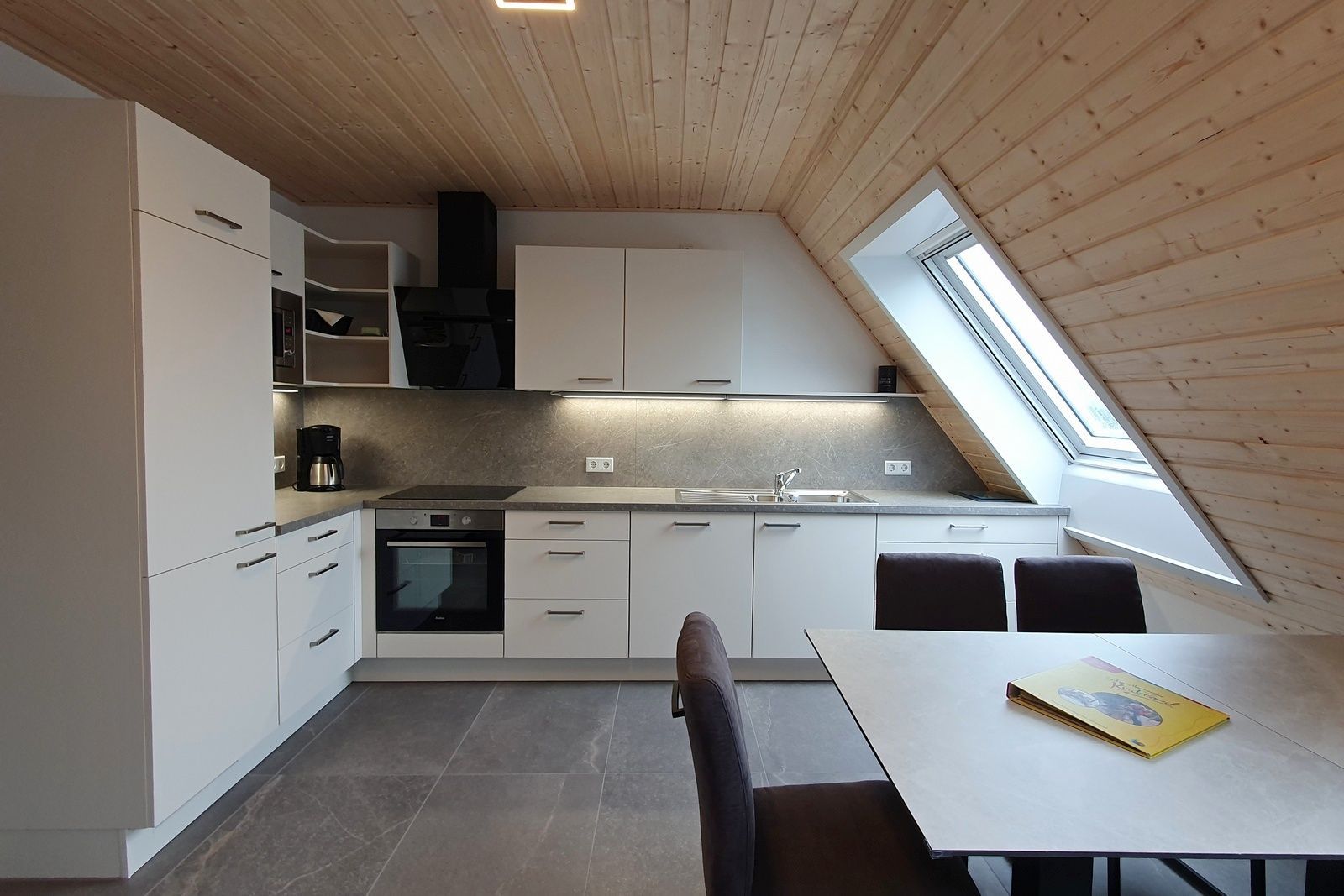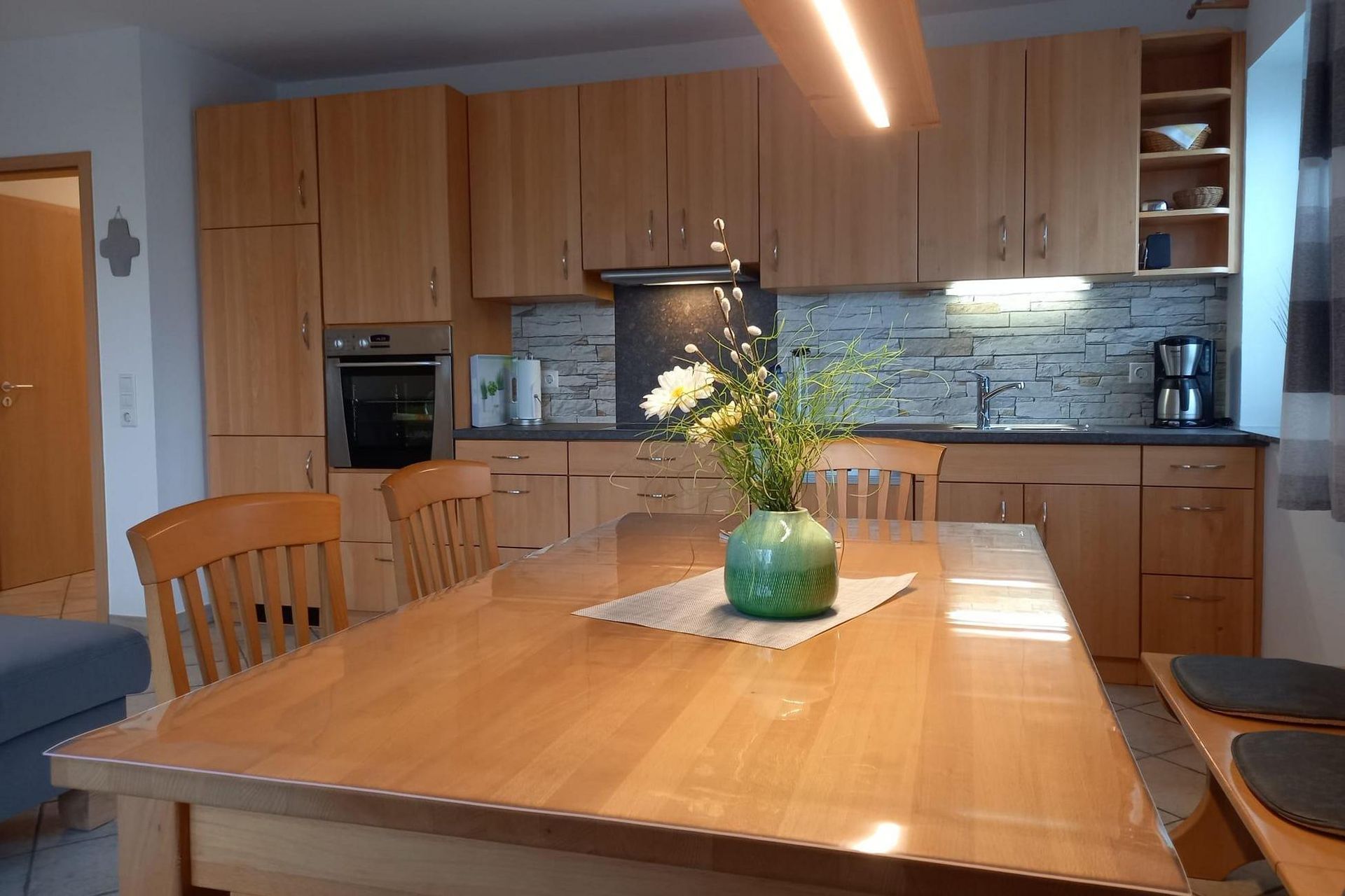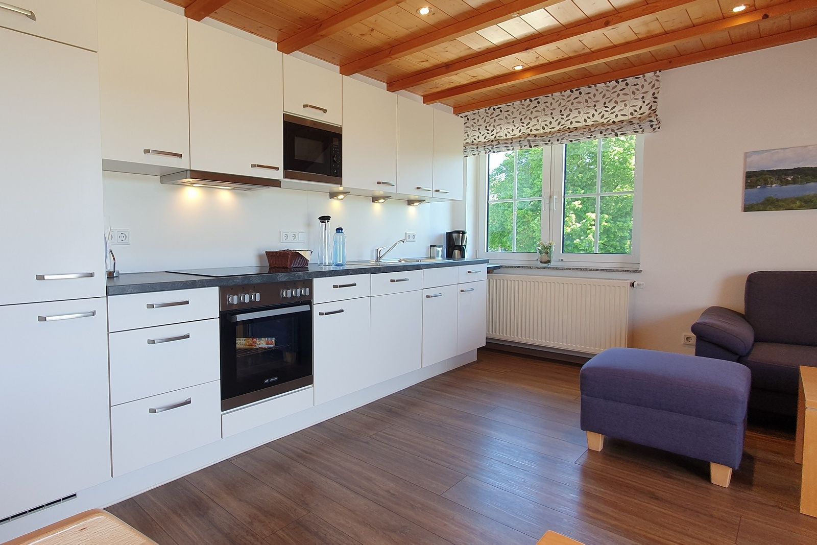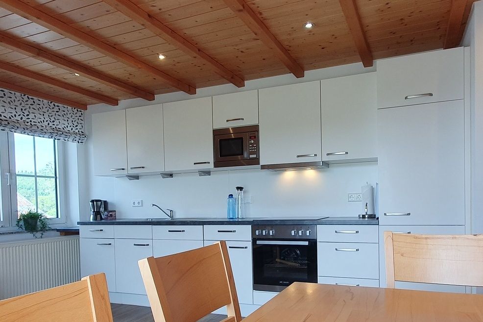 - Küchenausstattung: Kühl- und Gefrierschrank, Induktionsherd, Spülmaschine, Backofen, Mikrowelle, Elektrogeräte, ausreichend Geschirr